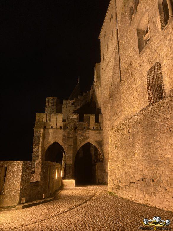 Nachdem wir in Segur les Villas doch noch auf einem sicheren Platz stehen konnten und uns – nach kurzem Leviten Lesen des zuständigen Dorfbewohners – noch ein toller Urlaub gewünscht wurde, tendierten wir dazu, doch eher wieder größere Straßen zu fahren. Nun ja, Frankreich macht es uns an manchen Stellen auch nicht ganz leicht, wenn mal wieder – mitten im Nichts – ein Verbotsschild für > 3.5 t auftaucht und man über noch kleinere Straßen zu einem Umweg gezwungen wird. Nur gut, wenn dann kein Gegenverkehr auftaucht, aber die Steigungen – oder das Gefälle – ist für Patsha teilweise nicht ohne. So meldet sich auch unsere Lenkung, die plötzlich Klappergeräusche von sich gibt und sich wabbelig anfühlt, und wir versuchen, alles was sich „Schraube“ nennt, anzuziehen. Zumindest eine der Briden dankt es uns. Bei Toulouse geht es auf Autobahnen drumherum und nach Carcassonne wollten wir eigentlich die Überlandstraße nehmen. Auch hier wieder ein Verbotsschild für > 6 t. Wir sind wahrscheinlich noch nicht abgebrüht genug, aber dann halt wieder auf die kostenpflichtige Autobahn zurück. Der Vorteil: So erreichen wir Carcassonne einen Tag früher, stehen auf einem gut bewachten WoMo Parkplatz und erleben die Festungsanlage bei Nacht. Ich war vor ca. 15 Jahren schon mal hier, tagsüber, an einem Wochenende und mit vielen anderen Touris, aber jetzt: Das Ambiente ist schon wirklich speziell! Im Dunkeln, bei Vollmond, kaum weitere Menschen in der Anlage, der Wind pfeift lärmend um die Ecken, und ein leichter Nieselregen sprüht ins Gesicht. Man fühlt sich wie eine Mischung aus „Eroberer“ und „Entdecker“ in den Gassen der Festung. Einfach abenteuerlich!