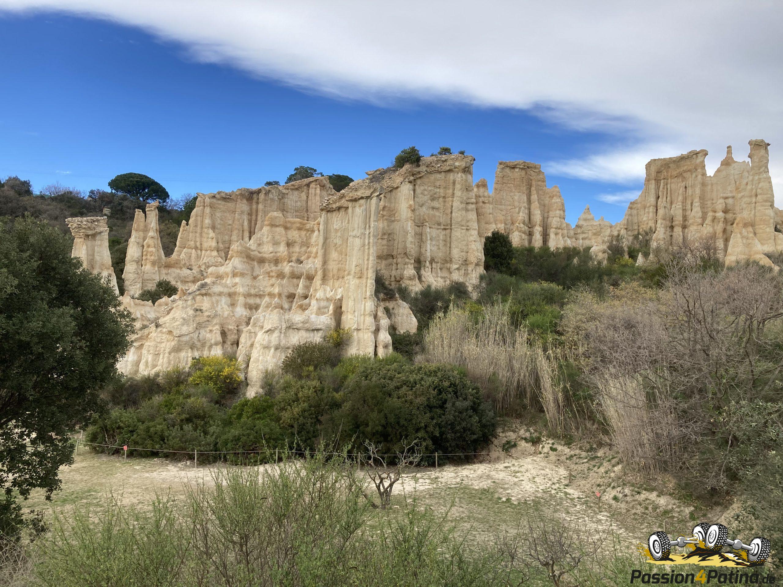 Am nächsten Tag schauen wir uns bei Ille sur Tet die Sandsteinformationen an. Zwar können sie längst nicht mit dem Brice Canyon mithalten, aber unser nächtlicher Stellplatz mit Ausblick darauf toppt doch den amerikanischen Campground nahe jener Sehenswürdigkeit in den USA. Als dann auch noch der Vollmond aufgeht… Toll!