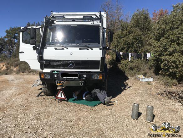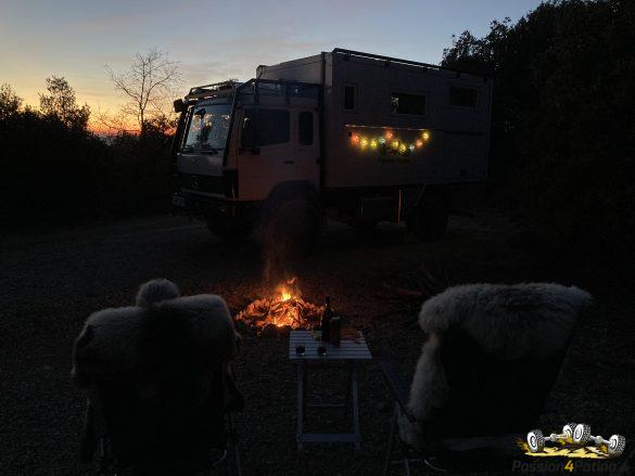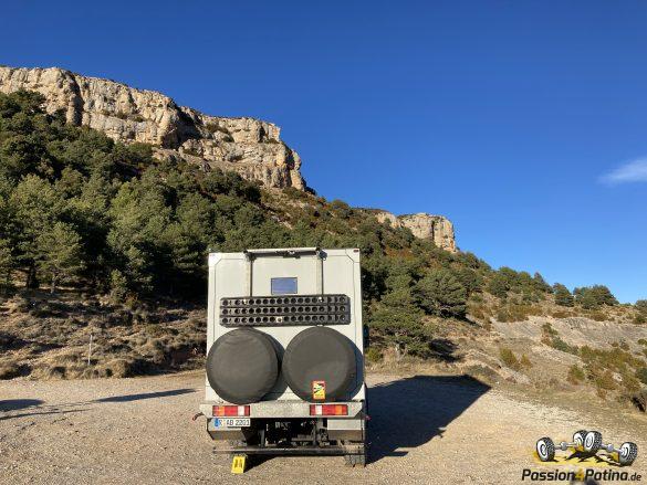So wie den nächsten Tag: Regen, der dazu geführt hat, daß über – vermutlich – den Zyklonfilter unsere Luftfilter mit Wasser vollgesogen wurden. Blöd, wenn auch nicht dramatisch, hat aber zu einer neuen roten Warnanzeige im Cockpit geführt (die leider bis heute immer wieder an geht, wenn wir bei Last fahren). So sind wir dann im Regen bzw. Nebel von der „Hauptstraße“ abgebogen, haben uns in die Berge „verkrümelt“, und – was sollen wir sagen – wurden am nächsten Tag mit einem erneuten Panoramablick verwöhnt. Ein Blick auf unsere Wetter-App – wir nutzen hier hauptsächlich „Yr“ – hatte auch schon Sonnenschein versprochen, und so dezimieren wir mal wieder unsere Wäscheberge aus allen Ritzen um unsere Waschmaschine herum. Selbst hier in der eher einsamen Gegend werden wir von Spaniern angesprochen, die interessiert an unserem Patsha sind. Zuvor wurden wir schon mal – bei unserer Zyklonfilter-Reinigungs-Aktion im Regen – mit „Servus“ begrüßt, von einem spanischen Pärchen, welches extra wegen uns angehalten hatte. Einfach super nett!