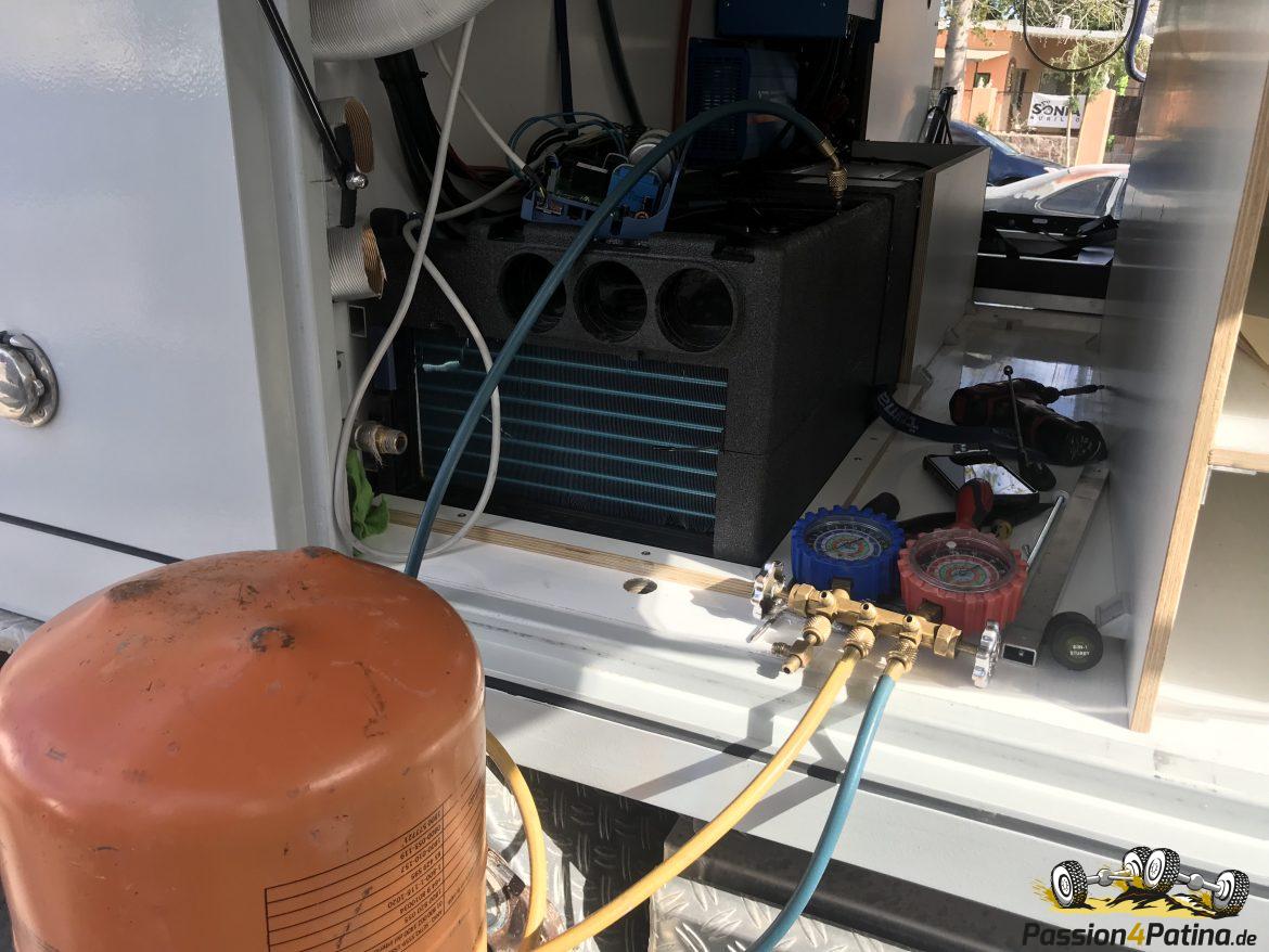 Als das Umkehrventil an einem späten Freitagnachmittag in der Woche darauf zu Carlos geliefert wurde, hat er sich trotz bevorstehenden Feiertages am Montag direkt an die Arbeit gemacht. Und wir wurden über die Schritte per Fotos informiert: Welch‘ ein Luxus! Als wir am Dienstag früh dann bei ihm auftauchten, war unsere Klimaanlage – also das Innere davon – schon mit Stickstoff auf Lecks geprüft und mit dem Spezialkühlmittel R407 C versehen. Nicht jeder hat dieses Kühlmittel vorrätig – so werden z.B. die Truma Geräte in den USA auch mit einem anderen gefüllt, was unsere Internetrecherche ergab – und wir waren froh, daß wir dieses schon bereits zu Anfang mit Carlos abgeklärt hatten. Als die Anlage mit viel Mühe an jenem Dienstag eingebaut war, war es schon recht spät. Aber wir waren super erleichtert, als sie tadellos funktionierte, Kühlen und Heizen. Carlos hat uns für die Zukunft noch ein Service Ventil auf der Kompressor Rücklaufseite eingebaut, über welches man besser Füllen bzw. die Anlage auf Lecks überprüfen kann. Original hat die Truma Klimaanlage nur eine abgeklemmte Leitung, da sie wartungsfrei sein soll. Die einzige Sorge, die wir hatten, war jetzt nur, daß die Anlage nicht richtig kühlt, denn sie zeigt ca. 200-300 Watt weniger Leistung an als zuvor. Grund ist der reduzierte Innendruck aufgrund weniger Kühlmittel. Carlos hatte uns hierzu geraten, da einerseits der Kompressor damit nicht über Gebühr strapaziert wird, andererseits unsere Anlage dann auch besser in der Höhe funktionieren würde. So haben wir die nächsten Tage unsere Klimaanlage immer wieder getestet, um möglichst noch in der Nähe von La Paz sicher zu stellen, daß sie durch den Einbau bedingt kein erneutes Leck bekommen hat. Von Carlos haben wir uns wie von einem guten Bekannten verabschiedet, so nett und gastfreundlich wurden wir von ihm aufgenommen, und durch ihn haben wir auch etwas Einblick in das aktuelle Leben, die Wirtschaft und die Politik in Mexiko erhalten. Neben vielen technischen Erklärungen über die Funktionsweise von Klimaanlagen. 😉