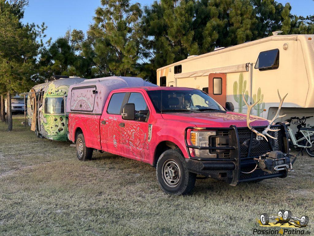 Seit 30 Jahren ist Drews bereits unterwegs: Respekt! Seine Kabine hat er auf seinen aktuellen Unimog mit Bj. Mitte der 80er-Jahre portiert und ist seit geraumer Zeit im nordamerikanischen Raum damit unterwegs. Begegnet sind wir ihm ihn Watson Lake (Mitte Juni ’24), als wir genüßlich unseren Burger vor dem Visitor Center gegessen hatten. 😉